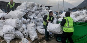 Last weekend, a group of Sherpas gathered outside Buddha Lodge in this speck of a town near Mount Everest, stuffing cloth sacks filled with thousands...